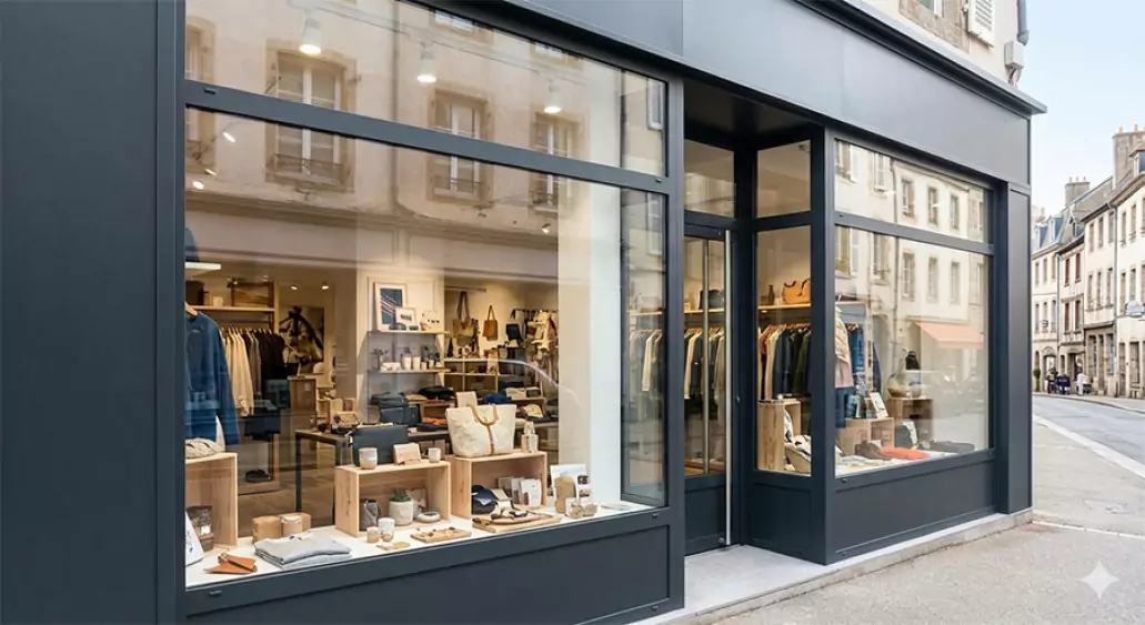 2. Soignez la visibilité et la sécurité : prévoyez un verre feuilleté de sécurité aux zones d’impact et des marquages visuels à hauteur des yeux pour éviter les collisions. Pour la fidélité des couleurs de vos produits en vitrine, optez pour un verre extra-clair sur les parties d’exposition. Complétez par un éclairage LED à faible UV pour limiter la décoloration des textiles et emballages.